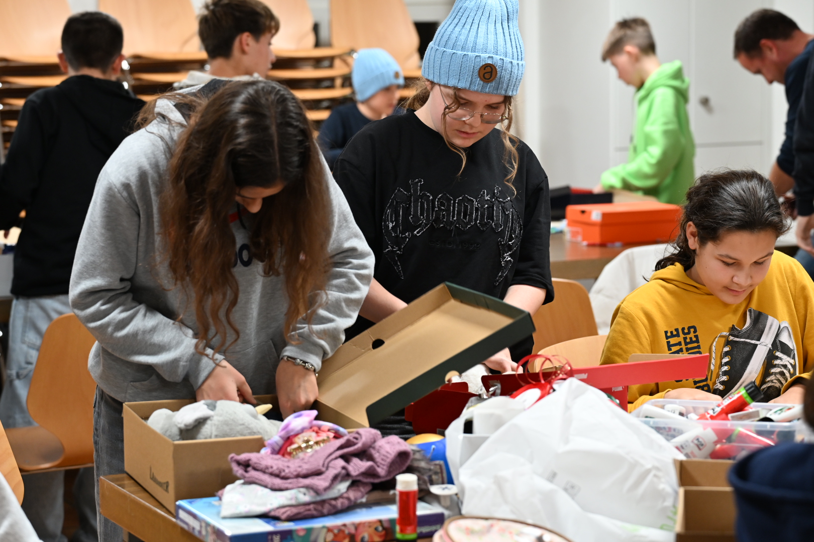Die Fachstelle besucht am Donnerstagabend die Gruppe aus dem Pastoralraum Mittleres Fricktal. Nach dem den Jugendlichen von Jugendseelsorger Simon Hohler die Aktion mit Bildern und einem Kurzfilm vorgestellt wurden, tauschten sich die jungen Teilnehmenden über die Umsetzung der 7 Werke der Barmherzigkeit aus – sei es durch Sozialstationen, Hospize oder Suppenküchen Anschliessend packten sie ihre Mitgebrachten Mützen, Spielsachen, Schreibutensilien und viele andere Dinge in Geschenkschachteln ein. Diese kommen der Aktion „Weihnachten im Schuhkarton“ zugute.